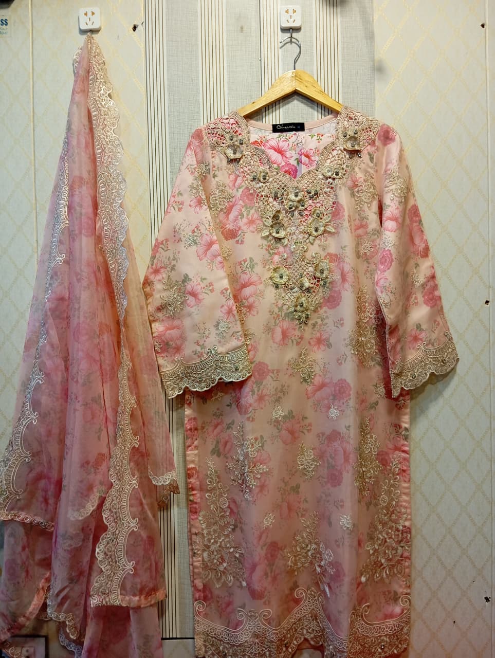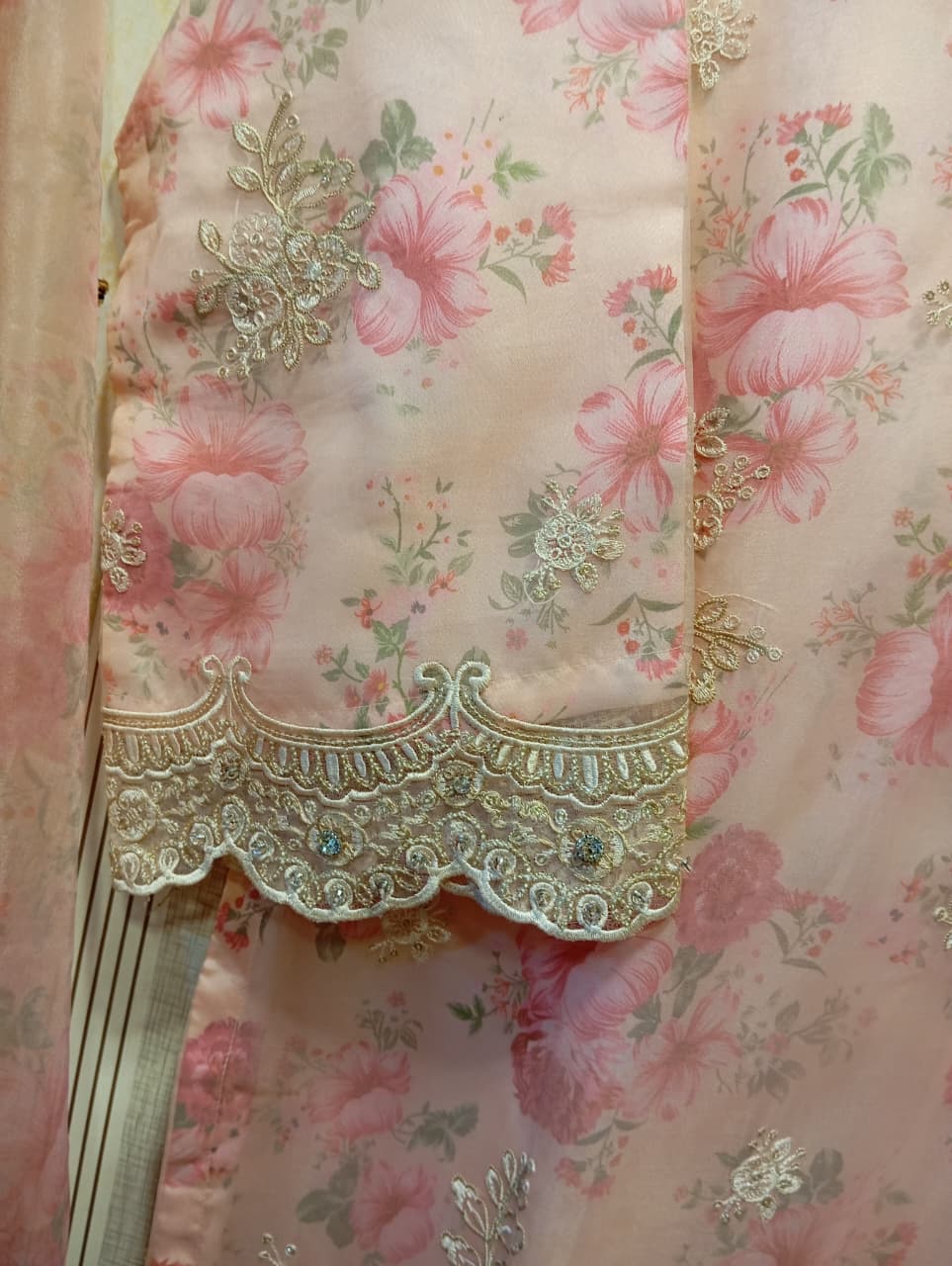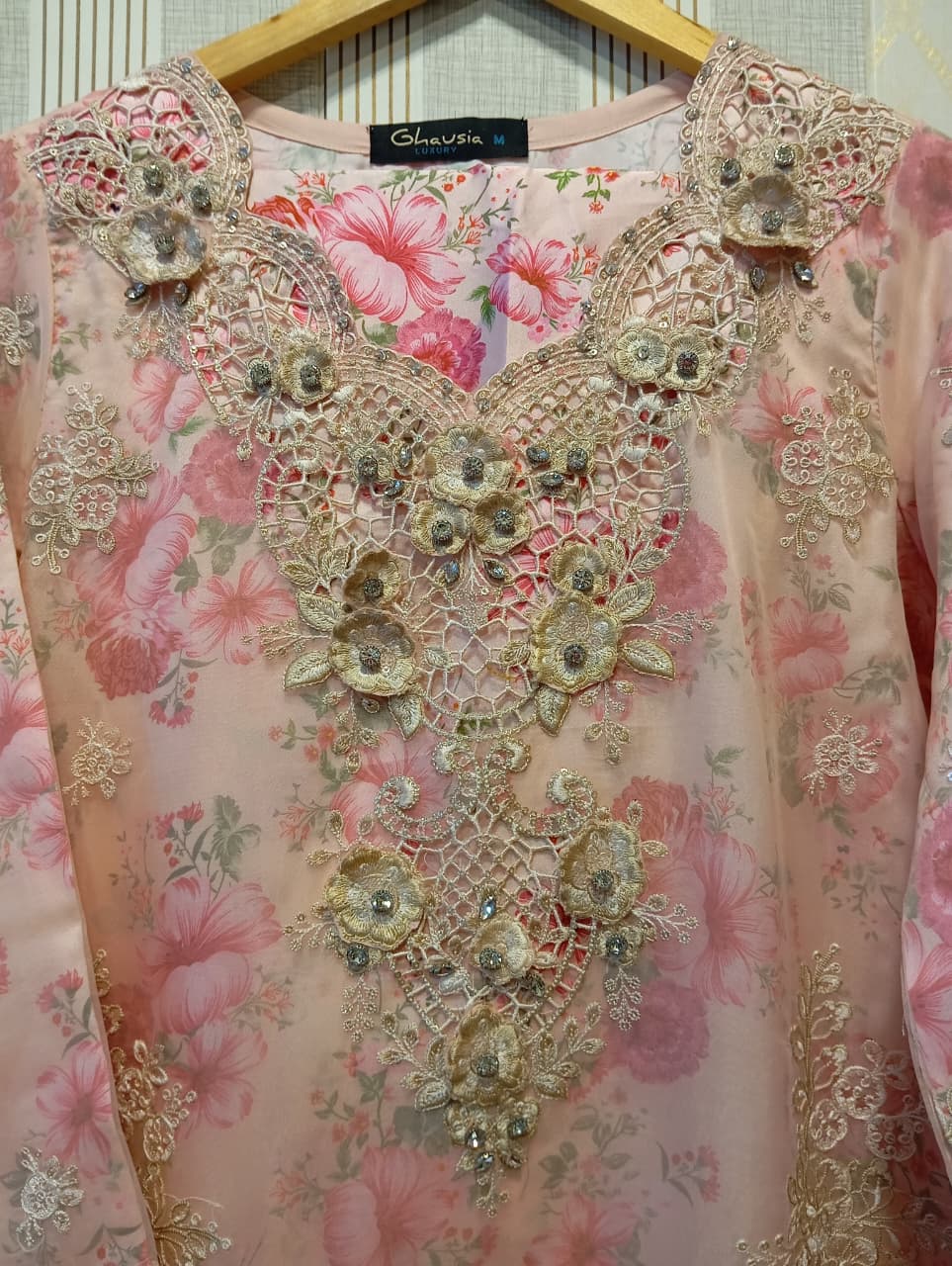 Neckline: The round neck is heavily adorned with intricate 3D floral appliqués, clusters of pearls, beads, and possibly light zari (metallic thread) work. This section is the main focal point.
