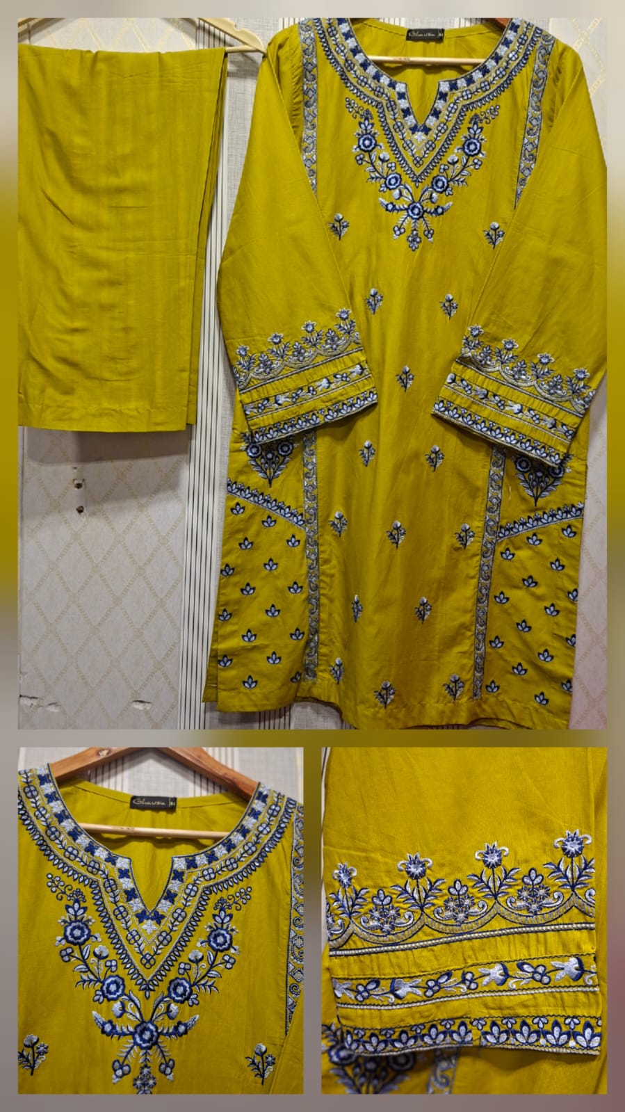 Jadeed aur Dilkash: Chamakdaar haldi peelay rang ka suit, jis par siyah aur sunahri dhaagay ki bhaari kashida kari (embroidery) hai. Is mein amoodi lineon ka saakht (texture) hai jo isay munfarid banata hai.